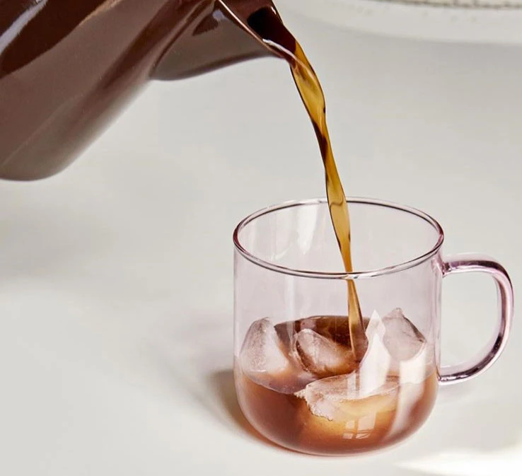 Coloured borosilicate glass is used to create this distinct and functional mug and cup duo. The mug has a rounder, more symmetrical shape, while the cup has a rimmed edge and arched handle. Synonymous with playful homewares design, known for their vast range of clean, colourful products. These expertly designed interiors items are at once practical and filled with character, from coloured glass drinkware to clever storage solutions. Material: Etched satin blown glass and painted metal.