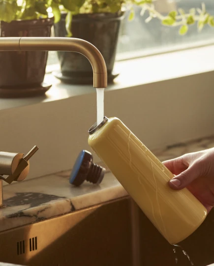 Contrasting colours make for a playful expression with George Sowden’s bottle series. Crafted in stainless steel with a plastic screw lid.