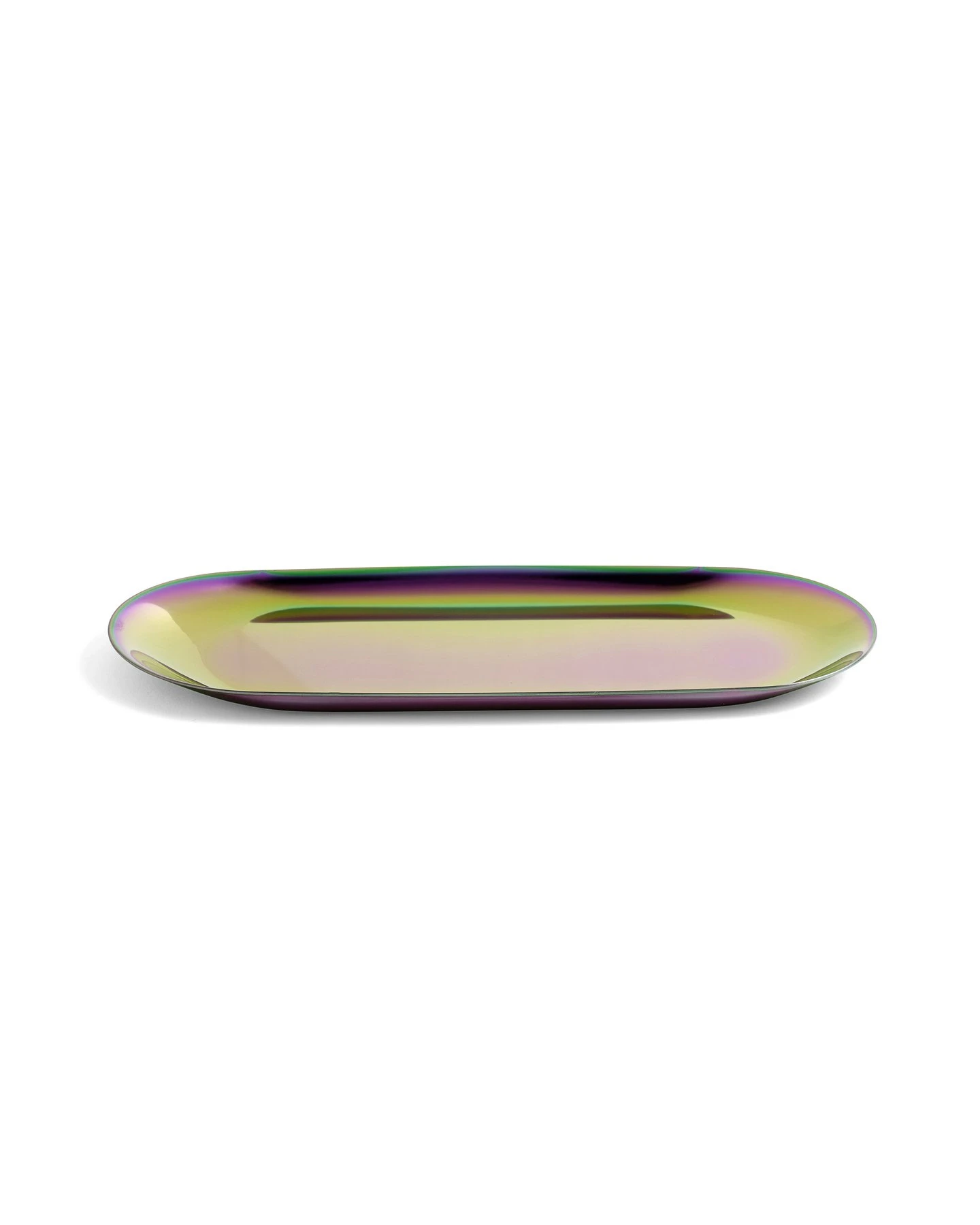 Bandeja con efecto arcoíris en acero inoxidable.