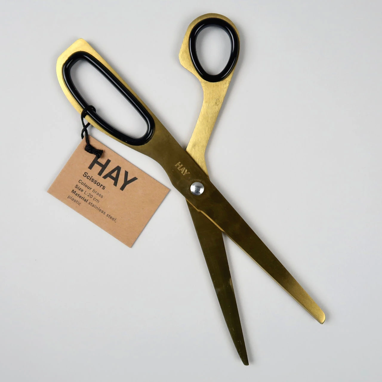 Polished brass coloured stainless steel scissors by Danish design house HAY. Handles have rubber inserts for comfort.