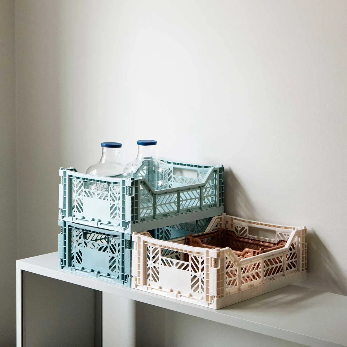 Color Crate ist eine Serie multifunktionaler Aufbewahrungsboxen der dänischen Designmarke HAY in verschiedenen Farben und Größen. Die belüfteten und stapelbaren Kisten sind unbedenklich für die Verwendung mit Lebensmitteln und zu 100 % recycelbar – für platzsparendes und farbenfrohes Verstauen. Größe: M – Länge 40 x Breite 30 x Höhe 14,5 cm Material: Polypropylen Farbe: Light grey (hellgrau) Storage Box von HAY in hellgrau aus 100% recyceltem Polypropylen.