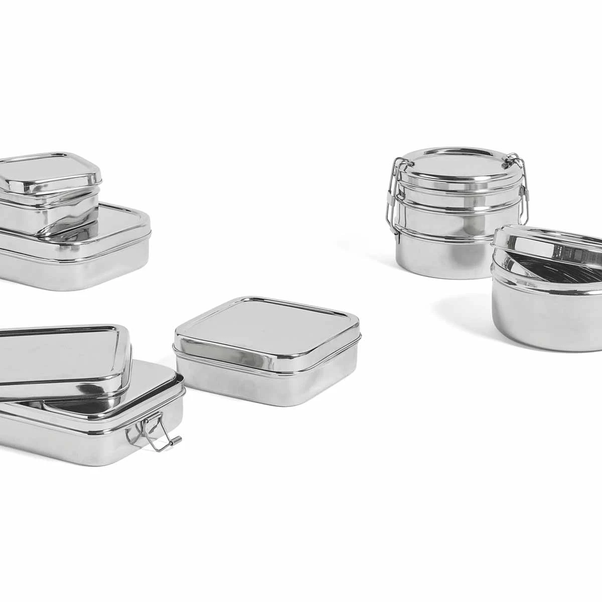 Die runden, rechteckigen und quadratischen Dosen von HAY verfügen über zusätzliche Schichten und Tabletteinsätze, die sie kompakt und praktisch für die Aufbewahrung von Lunchpaketen und anderen Lebensmitteln machen. Hergestellt aus lebensmittelechtem Edelstahl mit glänzendem Silberfinish, stehen vier verschiedene Designs zur Auswahl. Größe: Breite 10 x Tiefe 10 x Höhe 5 cm Material: Edelstahl Kleine praktische Lunchbox von HAY aus Edelstahl.
