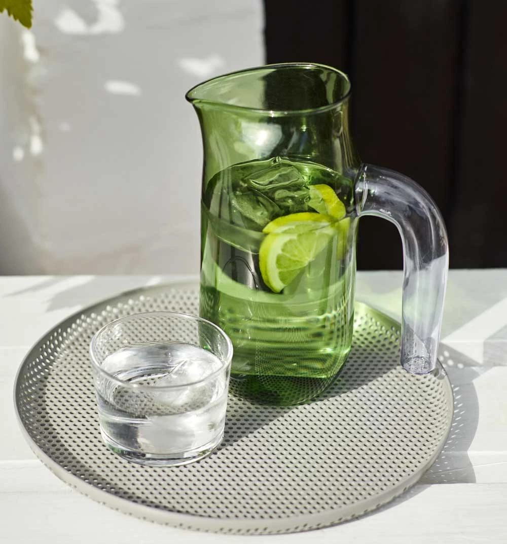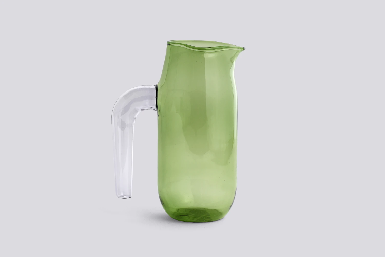 Glass jug with a simple and attractive design. Available in green and transparent colors.