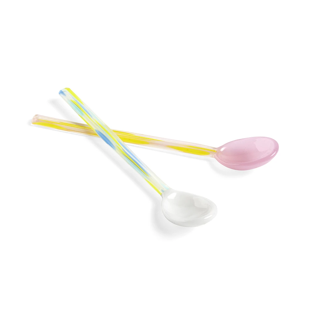 Pack de dos cucharitas de borosilicato hechas a mano. Tienen un divertido diseño y son adecuadas para especias, sal, postres, café, té o simplemente como decoración.