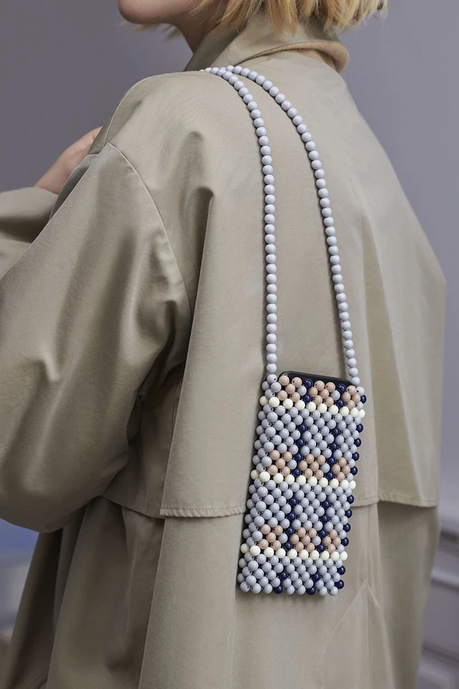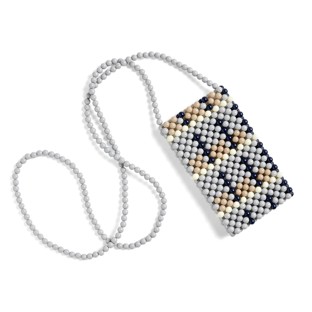 HAY’s Perla it’s a phone holder made from miniature coloured beads that are hand threaded into beautiful patterns; in this case a classic combination of grey, cream, camel and navy. Featuring a long shoulder strap, the holders can contain a wide variety of phones and, of course, other items as it works so well as a mini bag.