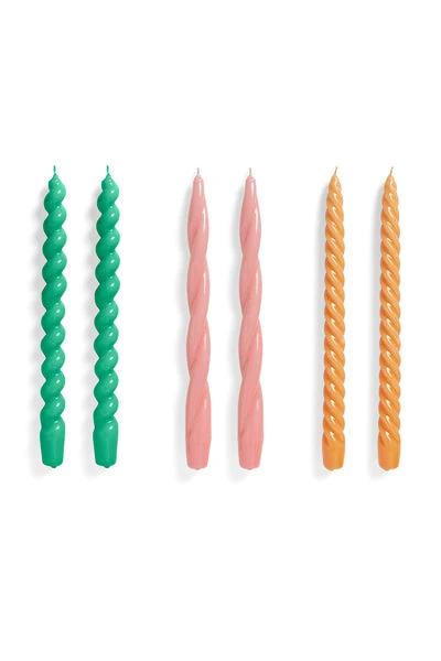 WHY WE LOVE: These candles offer a modern shape and colour palette to add decoration and light to any space Handmade in Italy the spiral candle set isn’t just for burning, the selection of complementary colours make them decorative elements in themselves. They come in twisted, conical, or spiral variants in a wide range of colours. Dimensions: Ø2.6 X H29 Materials: Paraffin Wax | Burning time 7hr Colours: Green, Dark Rose, Tangerine
