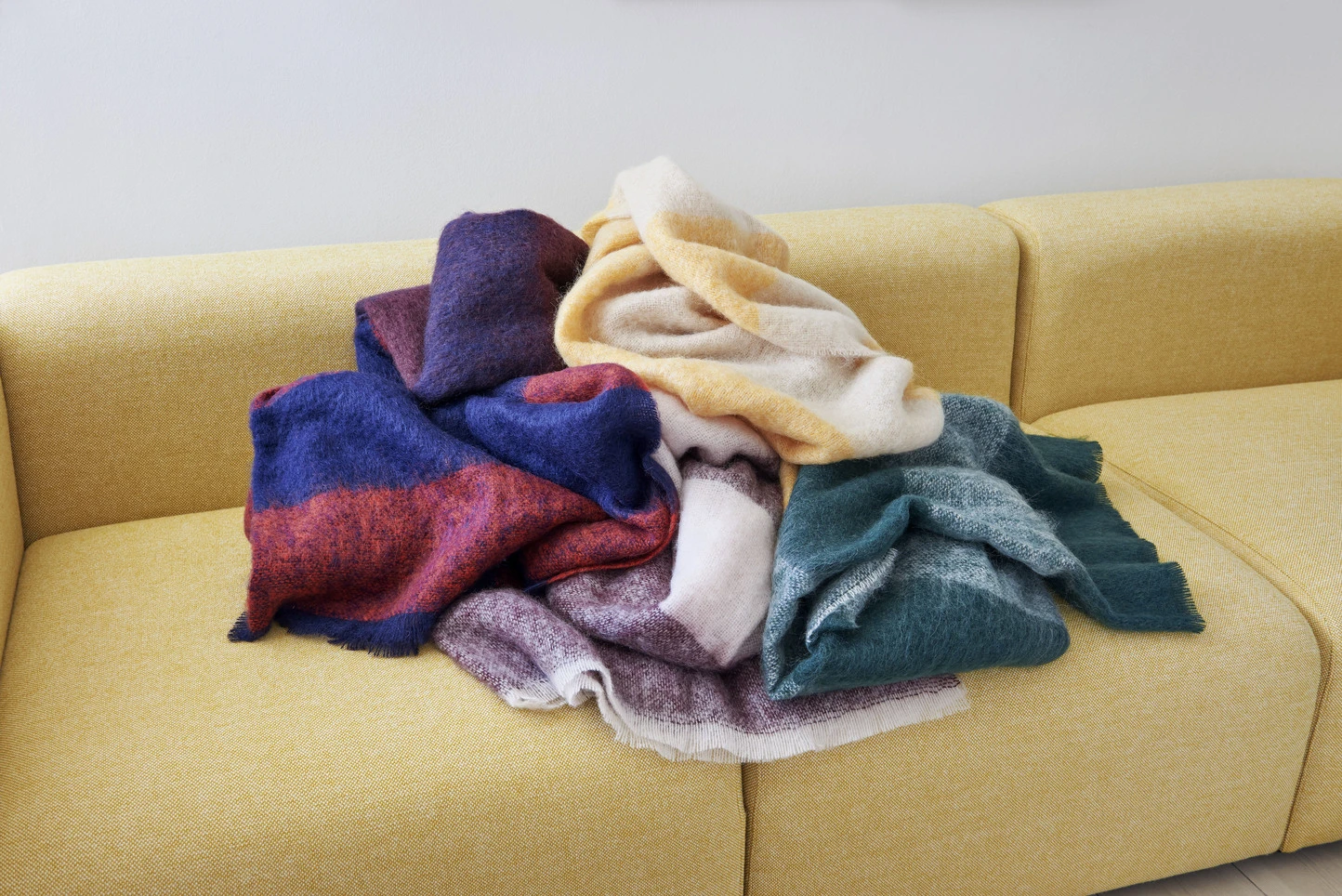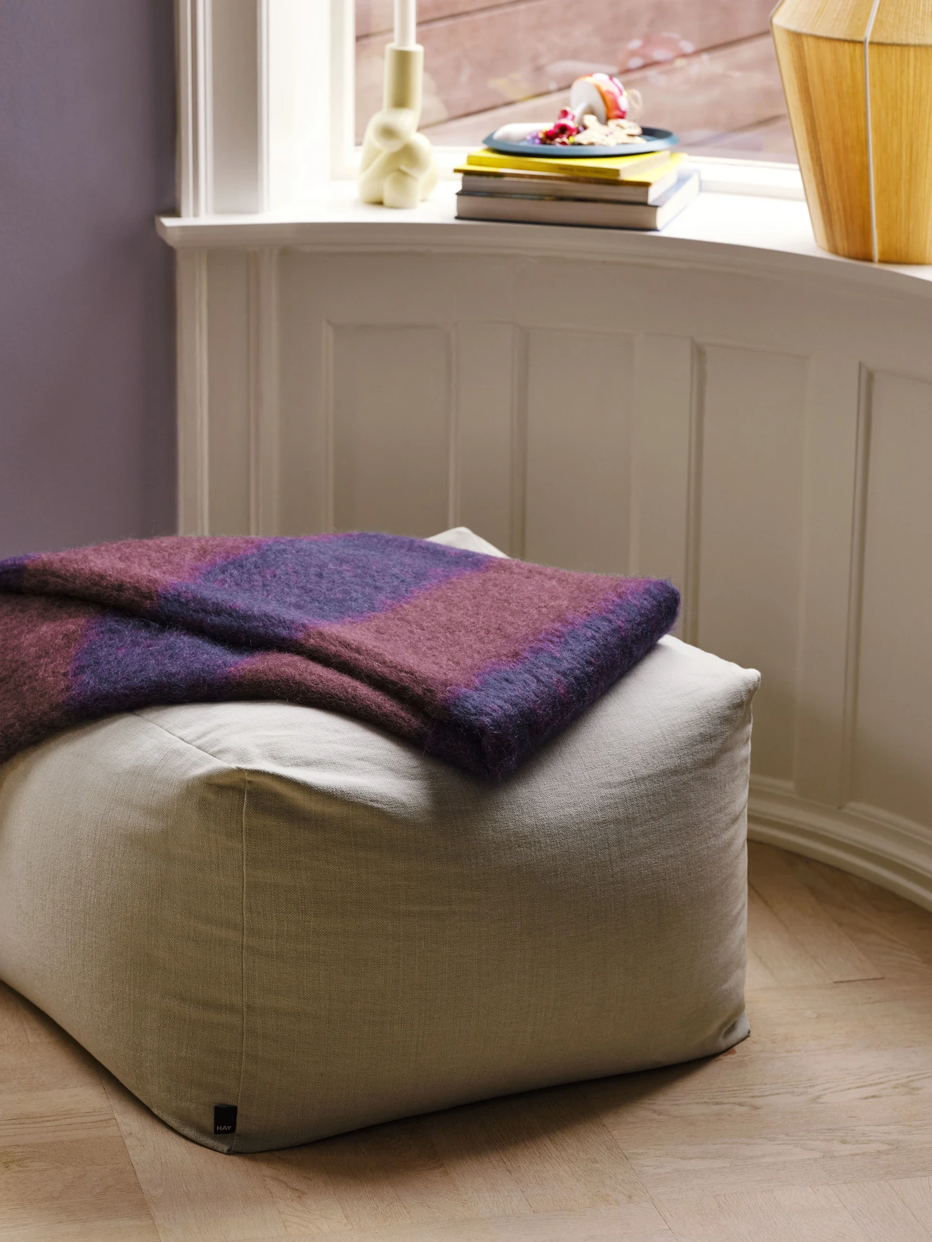 With its luxurious mohair-merino wool blend, HAY’s Mohair blanket has a thick, tufted texture in contrast stripes and is finished with fringed ends. Available in different colour combinations.