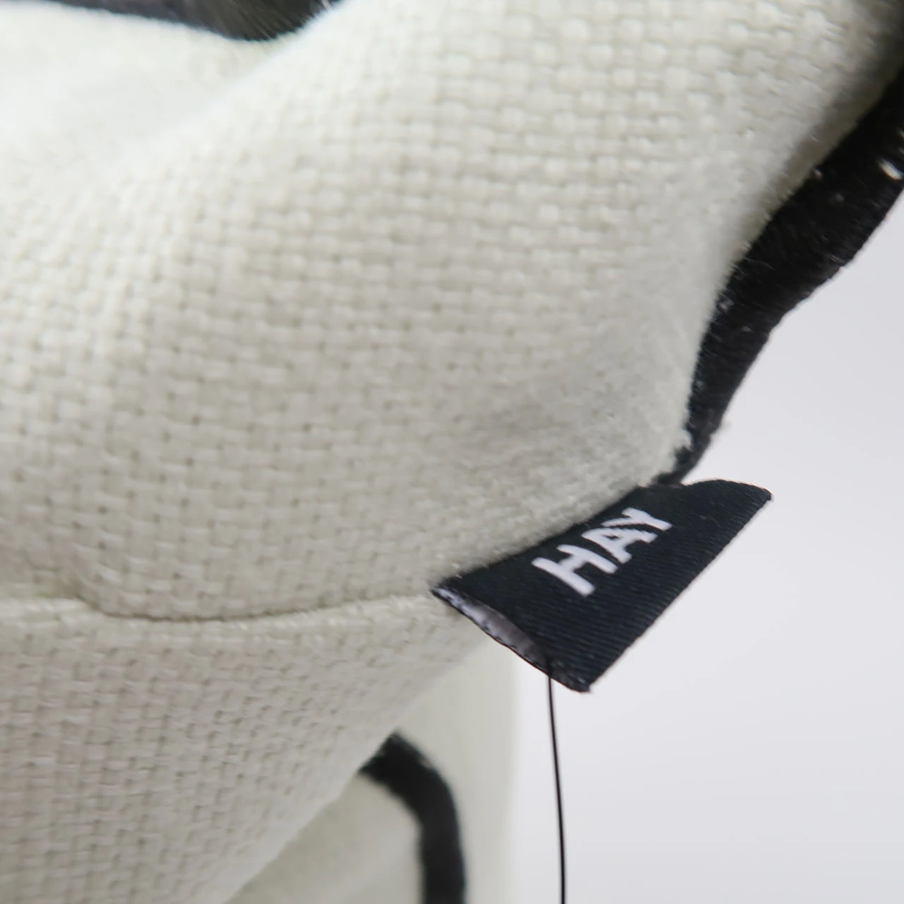 This cushion is made by HAY and the external fabric cover is a 75% linen, 25% cotton mix. It has a hidden zip closure on the reverse of the cushion with a colour matched zip and a small discrete HAY logo tag on the reverse as well.
