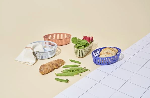 Inga Sempé’s series of metal baskets comprises more shapes with different outcuts, each featuring irregular jagged teeth to create a distinct appearance. Designed as a bread basket, but also appropriate for storing a variety of items in different rooms. The baskets come in several colours and are food-safe.