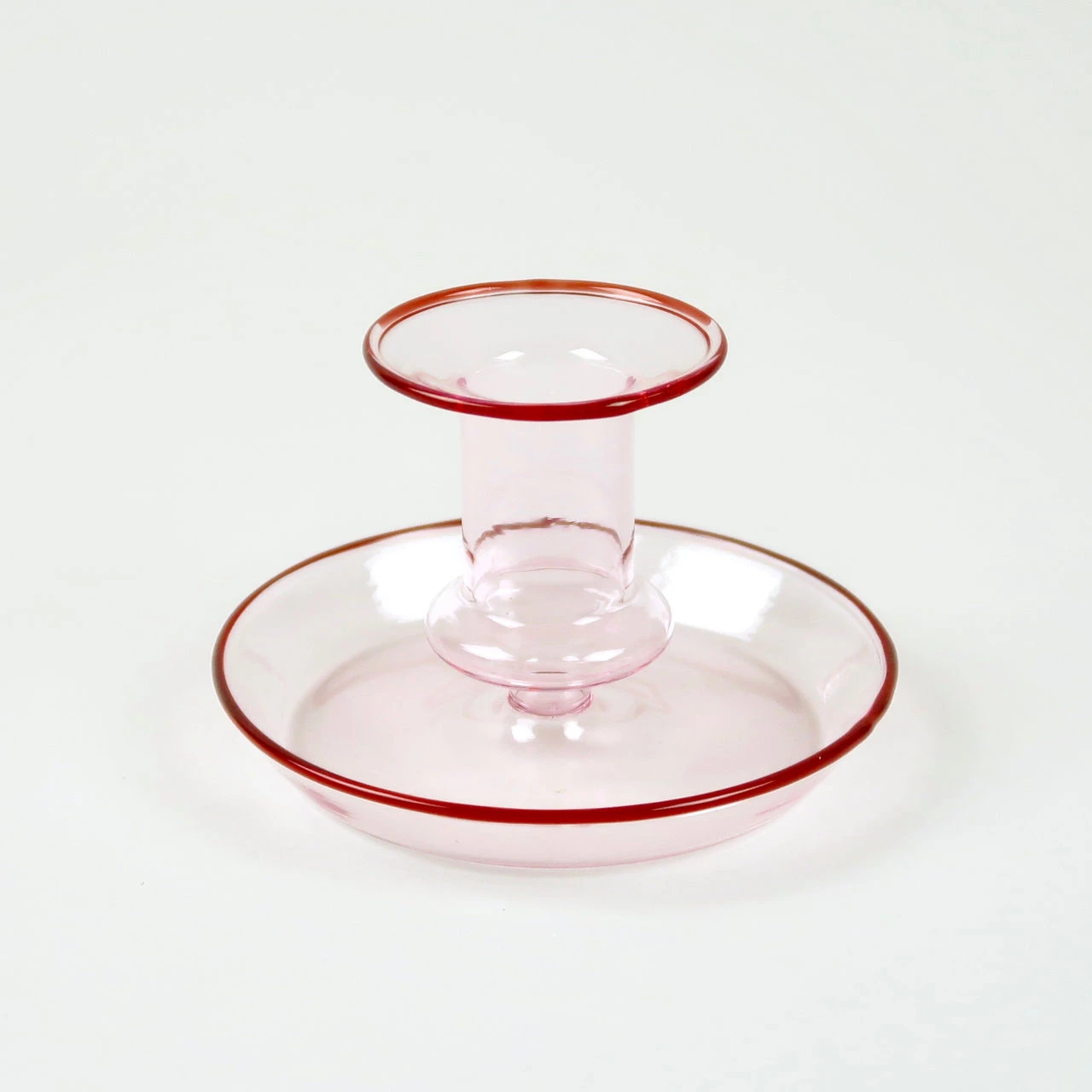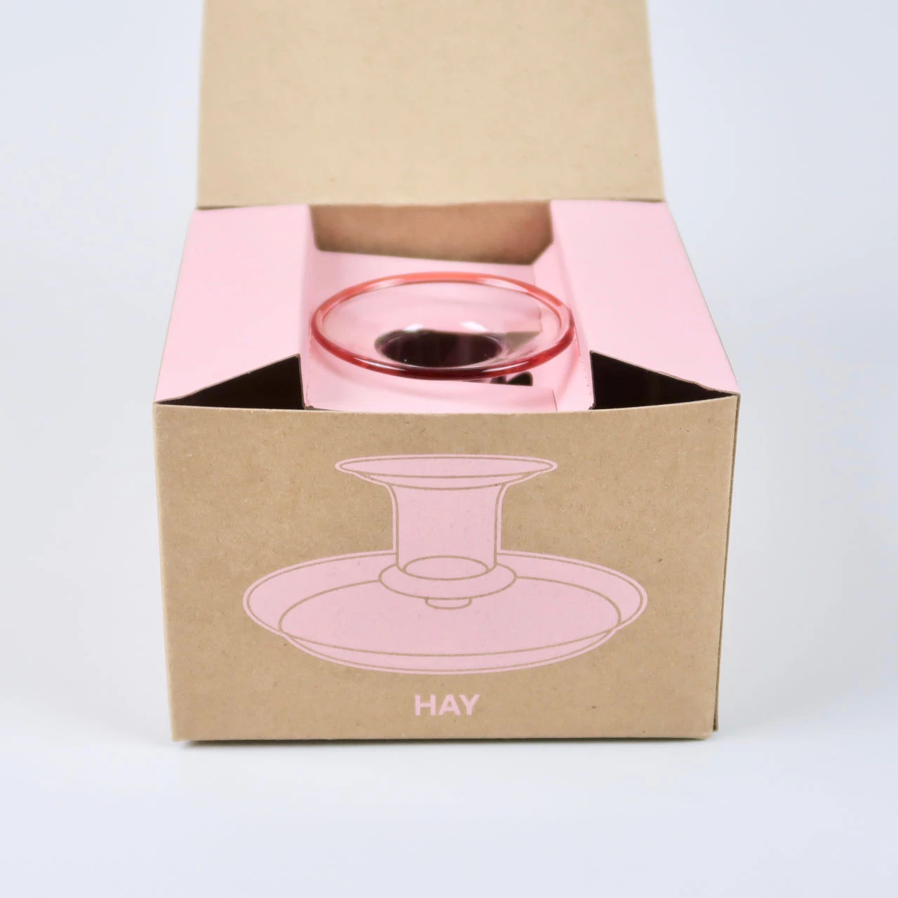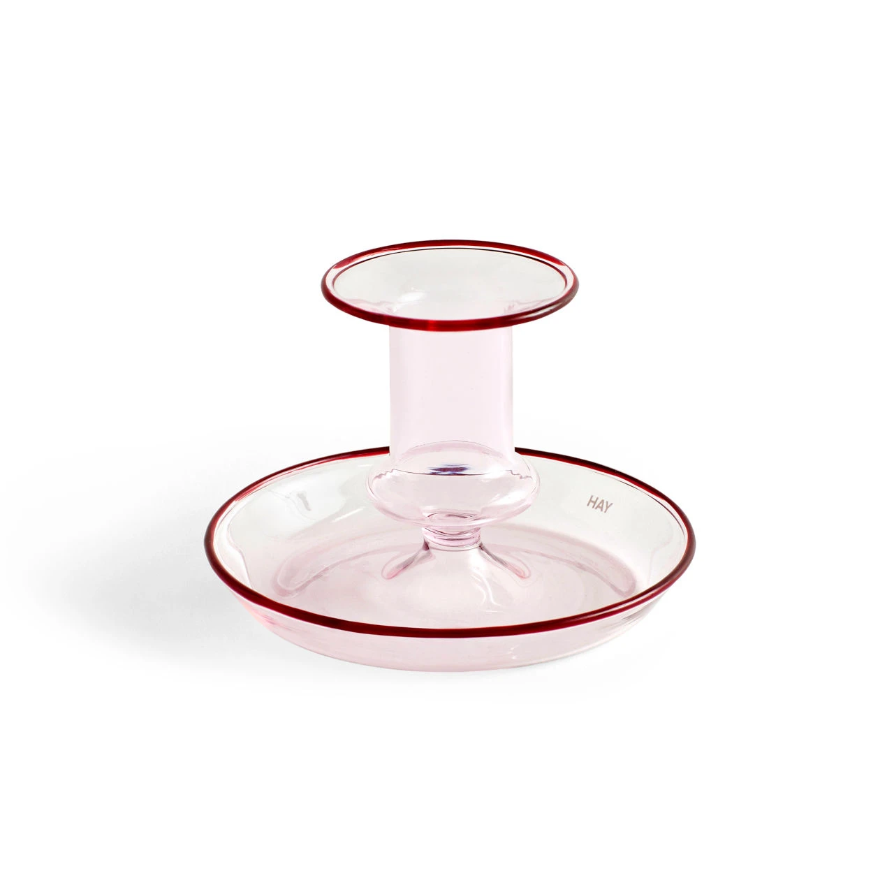 This glass candlestick is made by the danish design brand hay. It features a tray around the base of the candle holder which enables both the capture of any wax that drips from the candle and also provides a platform from which the candlestick can be gripped and moved from place to place. The candlestick comes in three different colour variations, pink, as here and also amber and yellow. The translucent glass would look great against a white tablecloth on a dining table and also lets the candlelight shine through. Comes in a hay branded box. Takes a standard dinner candle. Small variations can occur from one piece to another.