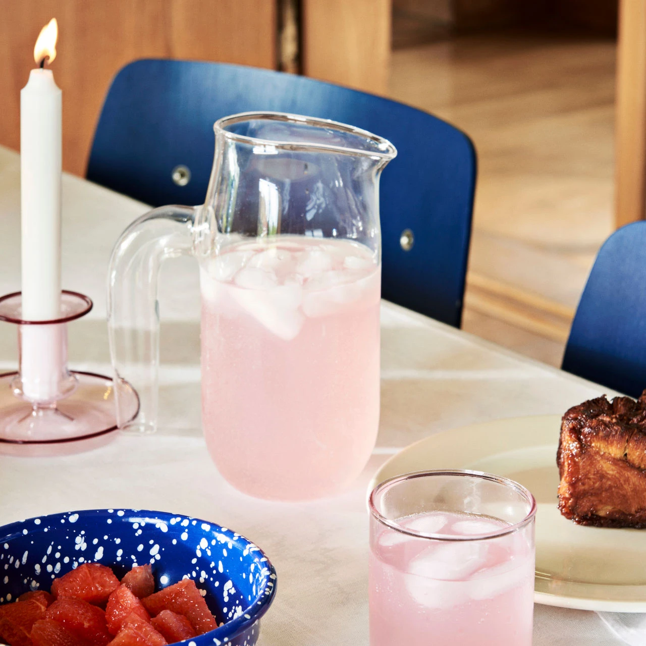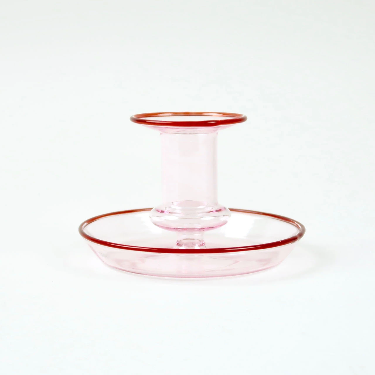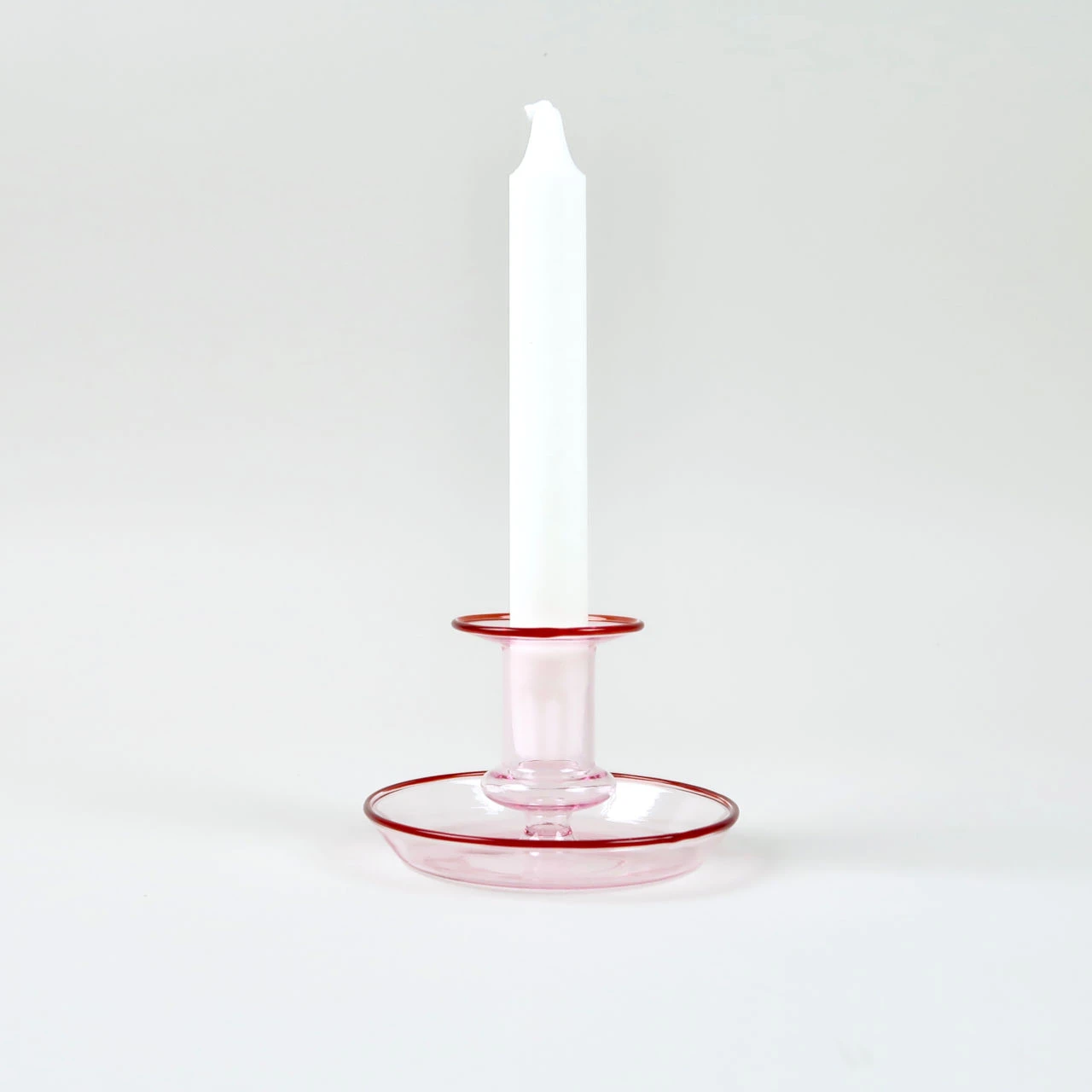 This glass candlestick is made by the danish design brand hay. It features a tray around the base of the candle holder which enables both the capture of any wax that drips from the candle and also provides a platform from which the candlestick can be gripped and moved from place to place. The candlestick comes in three different colour variations, pink, as here and also amber and yellow. The translucent glass would look great against a white tablecloth on a dining table and also lets the candlelight shine through. Comes in a hay branded box. Takes a standard dinner candle. Small variations can occur from one piece to another.