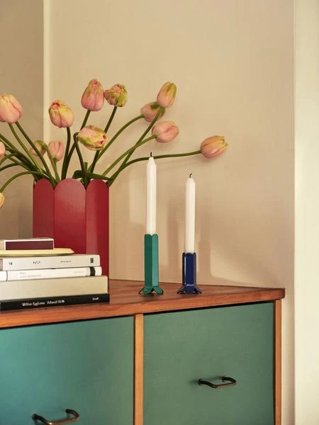 Diseñado por el dúo belga Muller Van Severen, el candelabro Arcs está formado por una cadena unificada de arcos verticales que envuelven la vela para crear una elegante silueta festoneada. Fabricado en aluminio y acero, Arcs Candleholder está disponible en dos alturas con diferentes opciones de color. Medidas: 5.5 x 13 cm