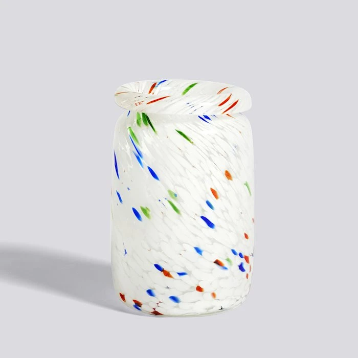 Hay’s White Dot roll-neck vase is meticulously glass-blown and manipulated into an irregular dotted design that’s perfect for displaying vibrant blooms.