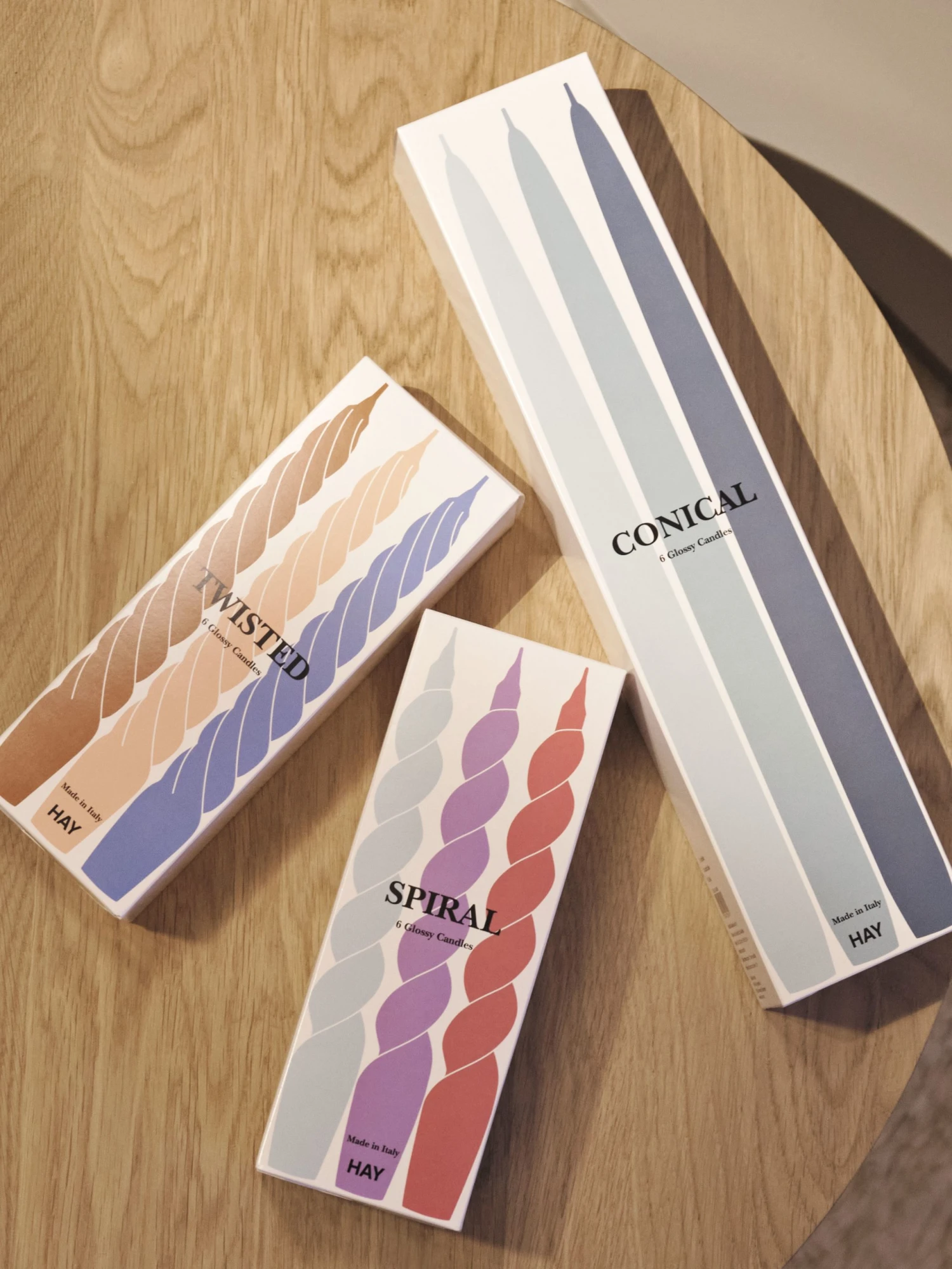 With their original shapes and extensive palette, HAY’s Candles aren’t just for burning; they can be used as decorative elements in themselves. Made in Italy, they come in twisted, conical, or spiral variants in a wide range of colours. This set has two of each colour: green, rose and tangerine and come in a box. Pair with a colourful candleholder for a bright, funky look.