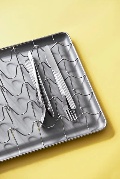 Uno scolapiatti non banale questo disegnato da Leon Ransmeier usa le sue linee ondulate per creare un design forte e funzionale allo stesso tempo. Questo scolapiatti in acciaio inossidabile è composto da un vassoio e una griglia separabili e lavabili in lavastoviglie. SPECIFICHE Materiale: Acciaio Inox Dimensioni: 40 x 29,5 x 10,5 cm