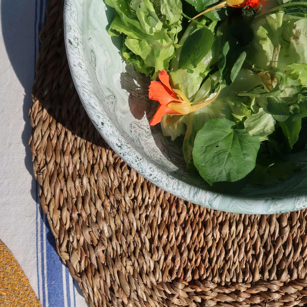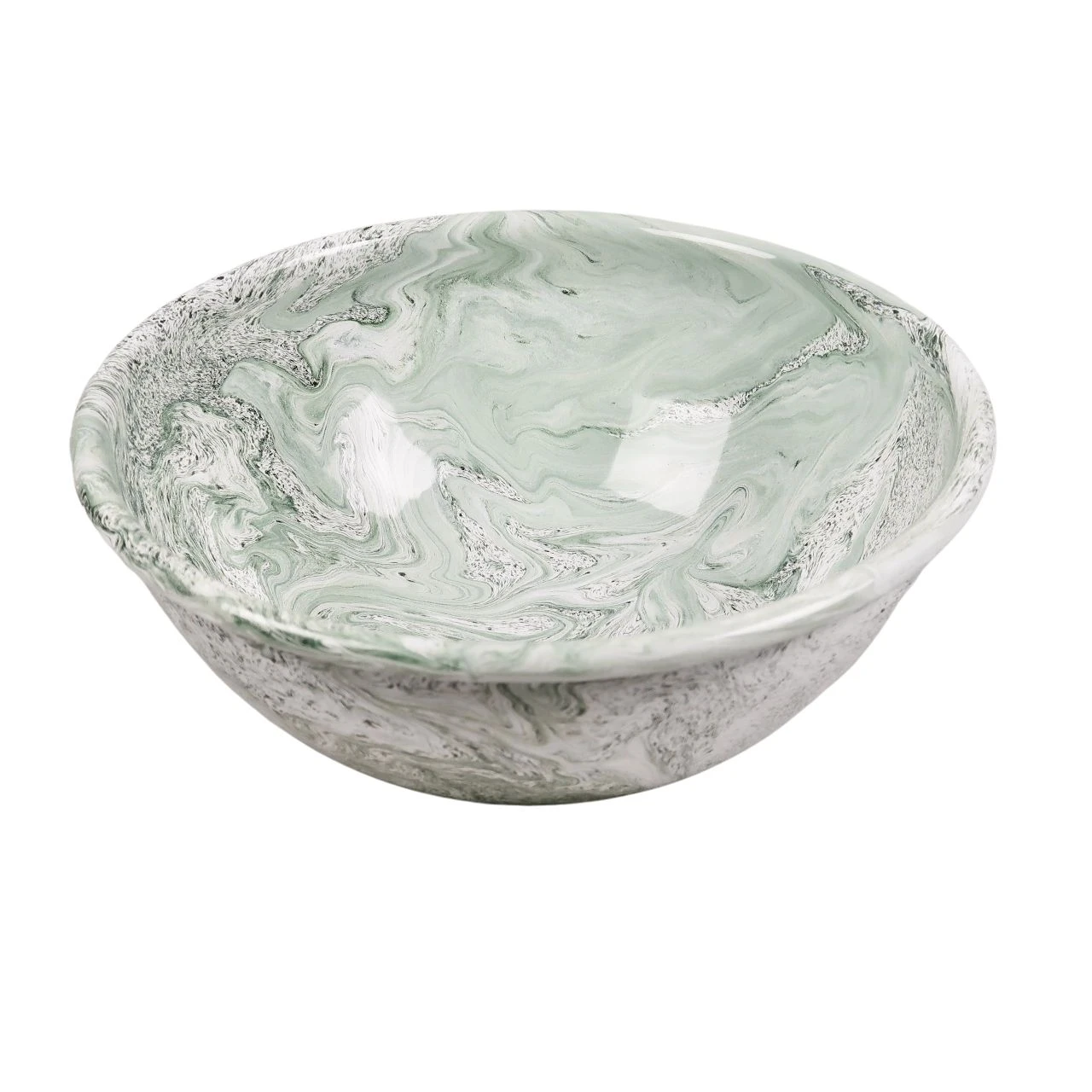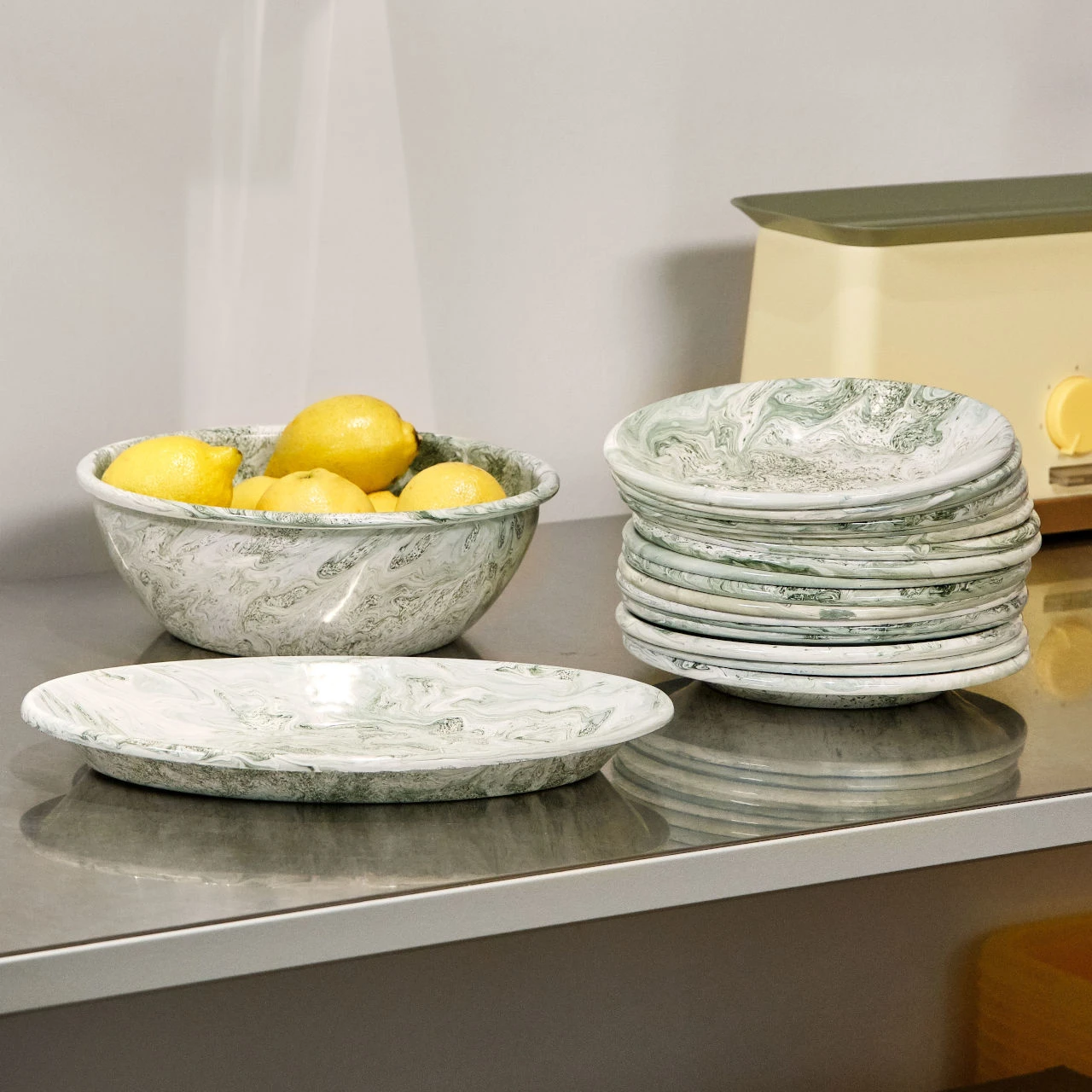 Soft ice salad bowl. This enamel dish is from a new range by hay. The enamelled steel has a green marbled pattern which differs across every piece that is made. The form of this bowl lends itself to being used for a huge variety of foodstuffs. I am envisioning that I might use it for a salad of radicchio, gorgonzola and walnuts to contrast with the pale green marbling or for a simple fresh green salad to complement the pattern. The dish is made in Turkey. We also have a shallow oval bowl with the same finish.