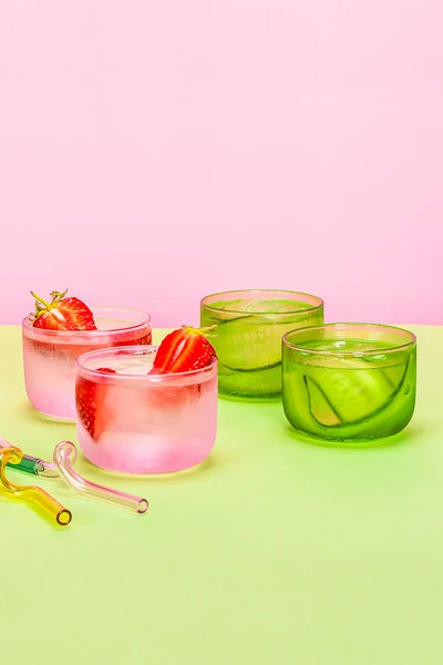 FROM: Denmark MADE: China WHY WE LOVE: Made from durable glass to add a pop of colour to your dining table This set of 2 softly tinted glasses are ideal for your favourite beverage. Holding 200ml of liquid and made from durable borosilicate glass the pair add to any dining arrangement. Dimensions: Ø7.5 x H5.5 Materials: Borosilicate Glass