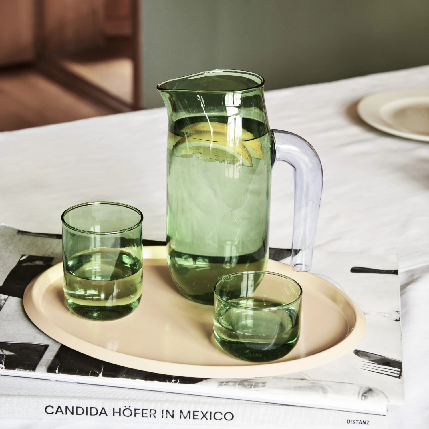 Featuring a smooth and elegant tinted treatment on borosilicate glass, HAY’s glass set offers a sophisticated touch of green to any of your meals.