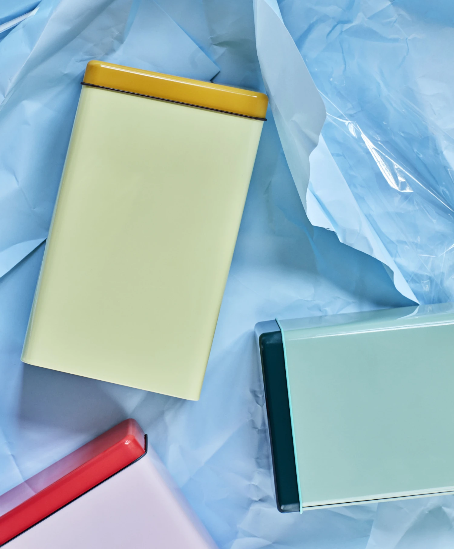 Designed by George Sowden the Sowden Coffee Tin is a colourful tinplate container with an airtight lid that is suitable for coffee and other dry foods.